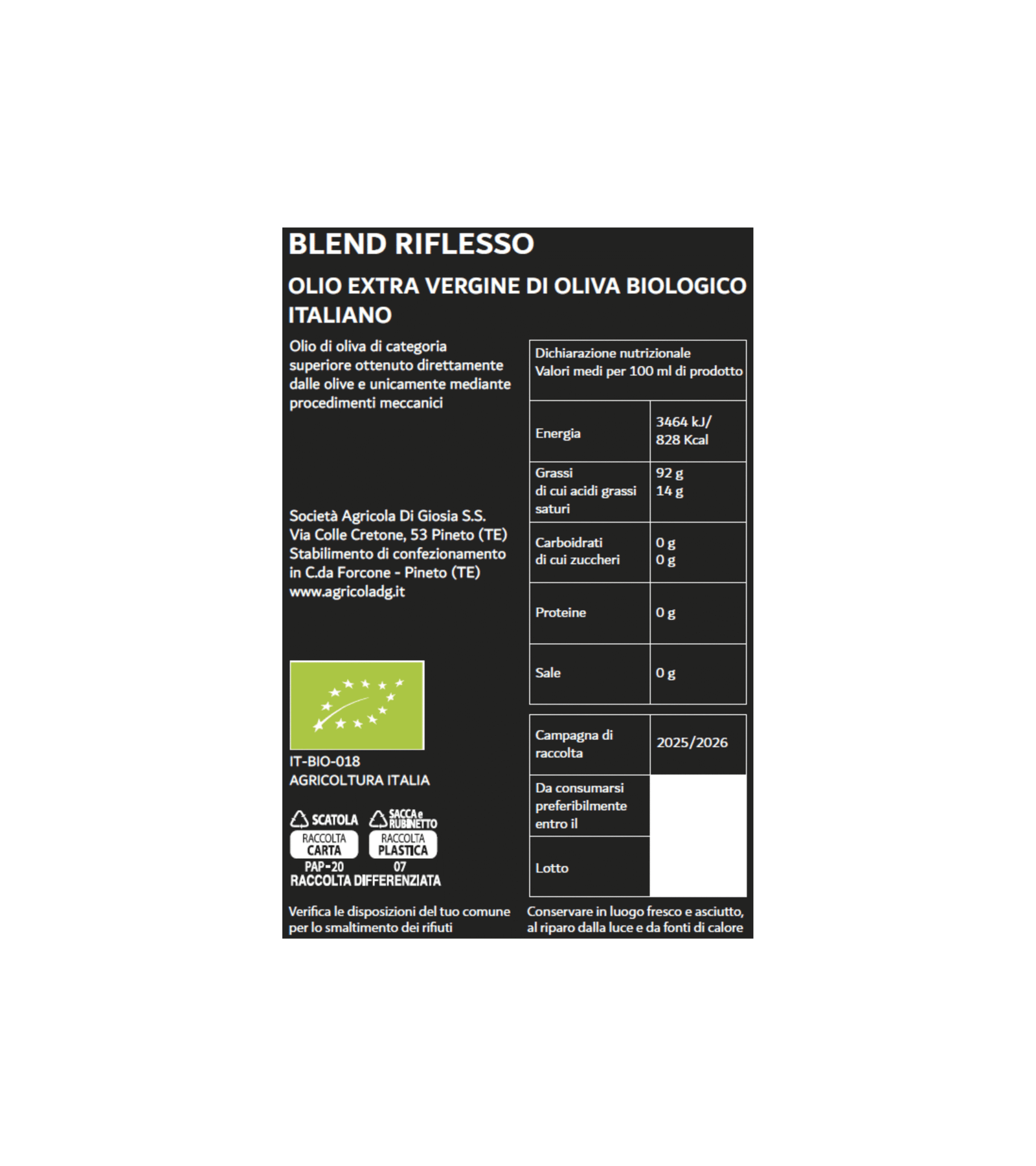 Il nostro Blend Riflesso è un Olio Extravergine di Oliva Biologico Italiano per amanti dei prodotti di alta qualità.