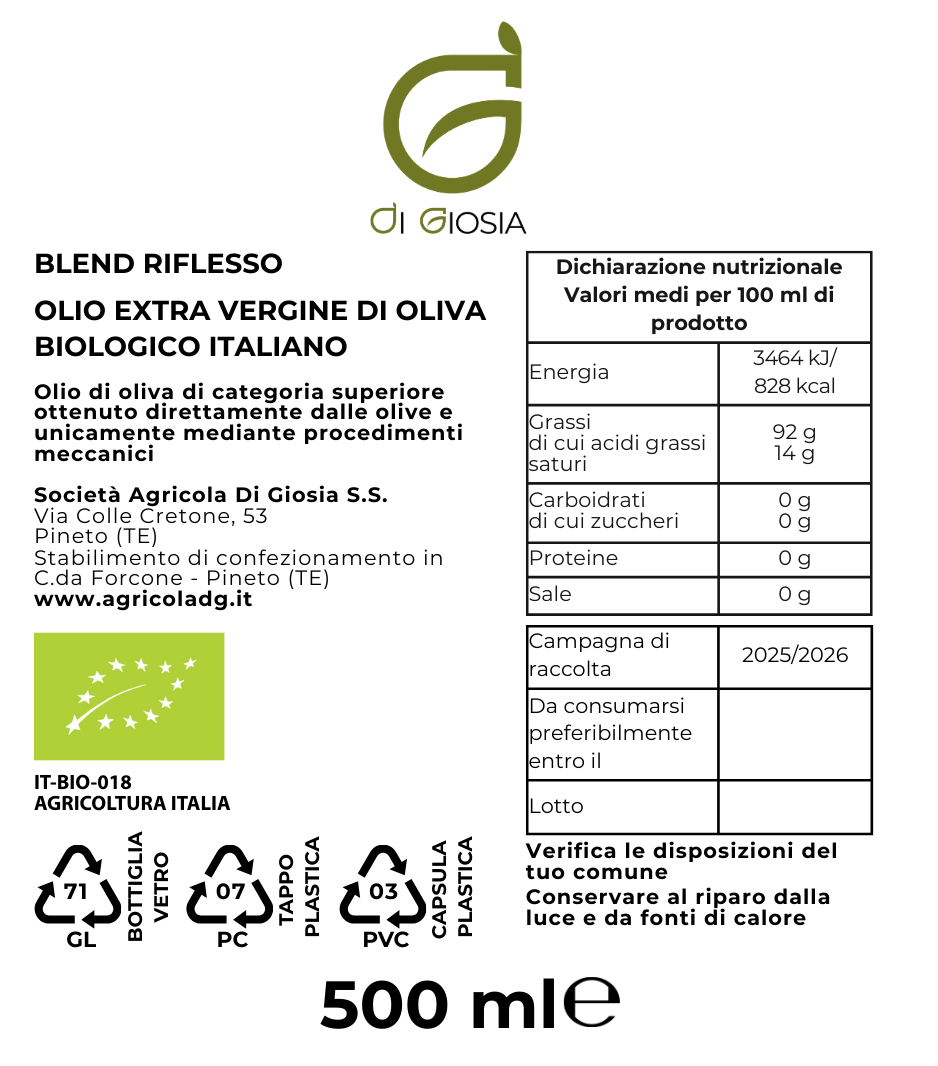 Olio Extravergine di Oliva Italiano Biologico - Blend Riflesso 500 ml - Campagna di raccolta 2025/2026